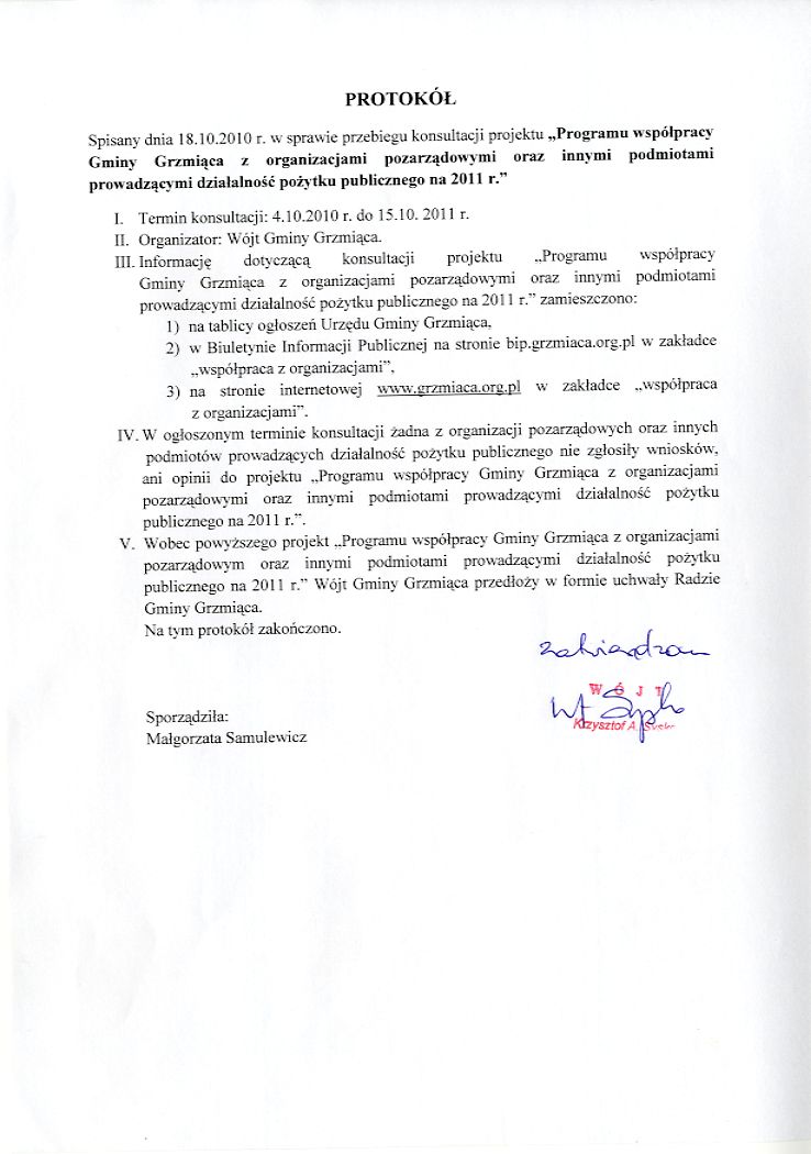 Protokół z przebiegu konsultacji projektu "Programu współpracy Gminy Grzmiąca z organizacjami pozarządowymi oraz innymi podmiotami prowadzącymi działalność pożytku publicznego na 2011r."
