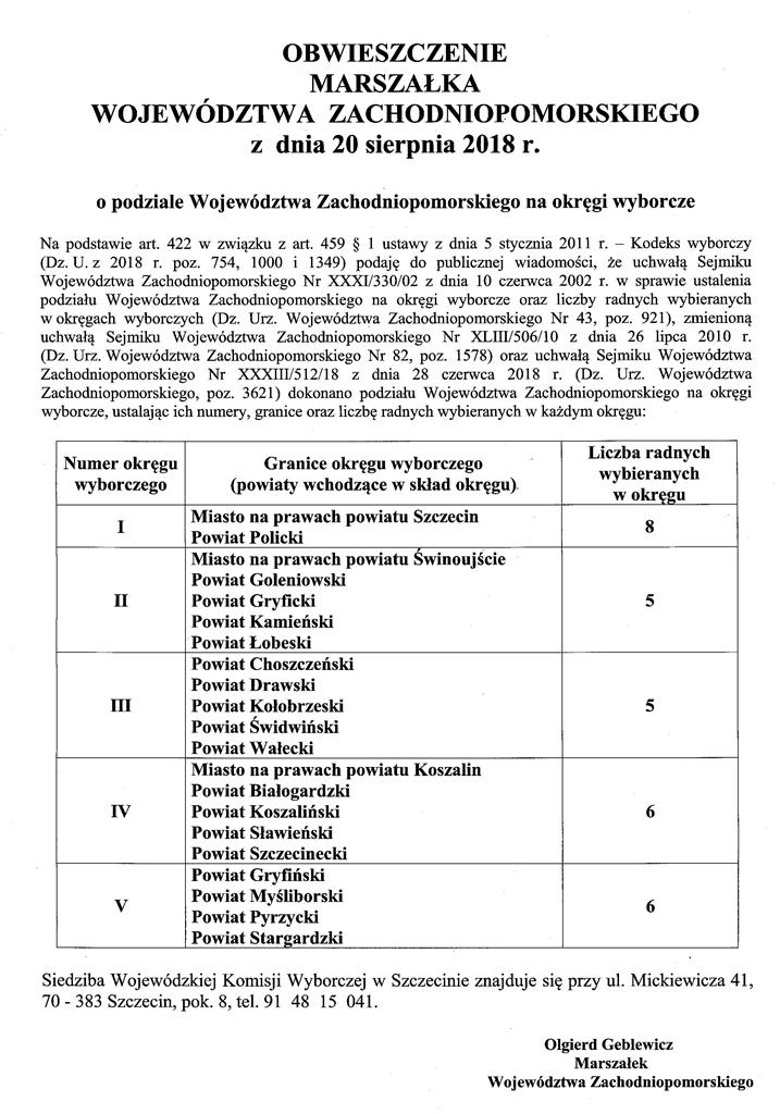 Obwieszczenie Marszałka Województwa Zachodniopomorskiego z 20.08.2018